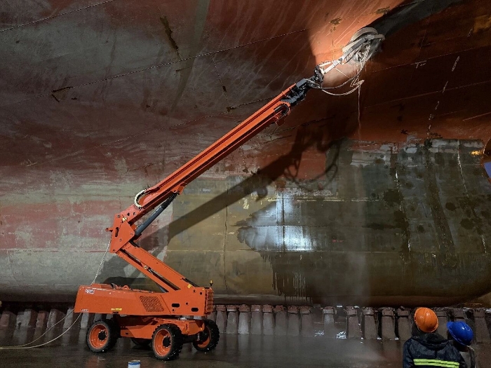 近期,以模块化臂式平台为基础,鼎力船舶除锈喷涂机器人系列再添一员,且已正式服役于某船厂。