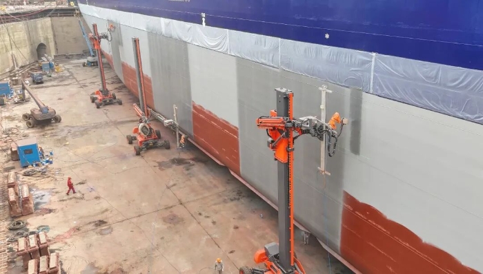 传统的船体除锈、喷涂作业,长期依赖人工,效率低、成本高、品质差,还面临严重的安全与环保问题。鼎力创新性地将高空作业平台与机器人技术深度融合,打造了一套集成化的智能作业系统,真正实现均匀、高效的除锈与喷涂作业,彻底解决了行业痛点,为全球船舶修造业树立了智能化转型的标杆。